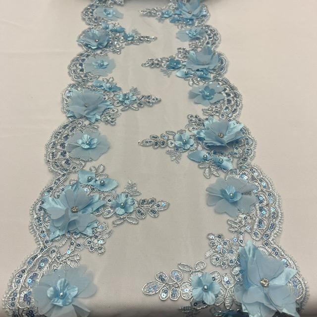 Baby Blue Beaded Lace Table Runner – 3D Embroidered Lace with Pearls & Crystals | Wedding, Table and Home Décor – VT-34