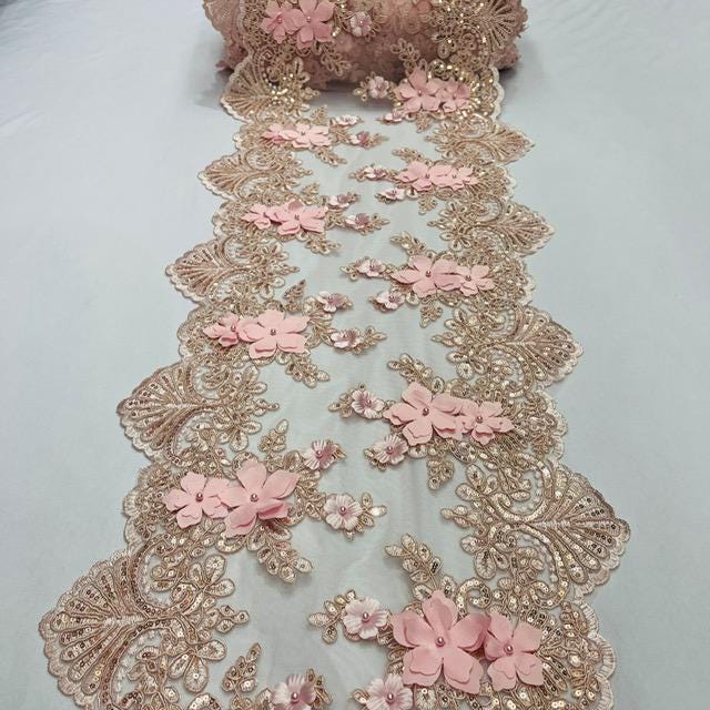 Infuse your event with romance and elegance using this Blush Beaded Lace Table Runner. Featuring delicate floral embroidery, shimmering sequins, and pearl embellishments, this 3D lace fabric embodies grace and femininity. The soft blush tone is ideal for weddings, bridal showers, or refined home décor.