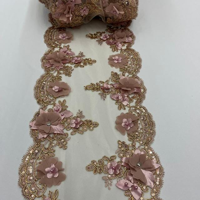 Dusty Rose Beaded Lace Table Runner – 3D Embroidered Floral Lace with Pearls & Crystals | Wedding and Event Décor – VT-34