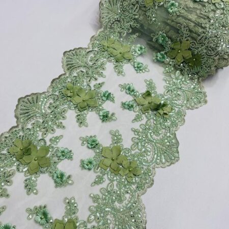 Elevate your next design with this exquisite embellished lace fabric featuring delicate 3D floral embroidery and hand-sewn pearls and beads. Crafted on a soft, high-quality mesh base, this fabric offers elegance, movement, and dimension—ideal for bridalwear, couture gowns, and decorative accents.